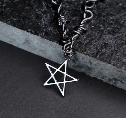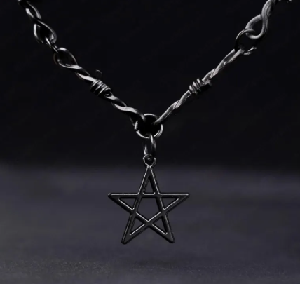 Embrace your dark side with the Barbed Star Choker, a fierce fusion of gothic symbolism and punk rebellion. Centered around a pentagram pendant wrapped in barbed wire detail, this necklace captures the essence of power, mystery, and untamed spirit.