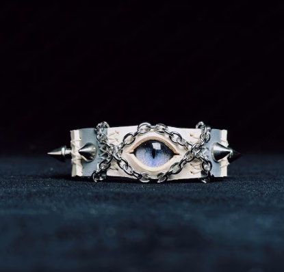 This cuff is insane in the best way — the eyeball and chains make it look so hardcore.