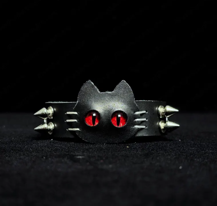 Add an edge to your style with the Spiked Cat Eye Leather Bracelet, a bold accessory that fuses punk rebellion with gothic allure. Featuring a sleek faux leather band adorned with metal spikes and a striking cat eye centerpiece, this wrist cuff exudes confidence, mystery, and individuality.